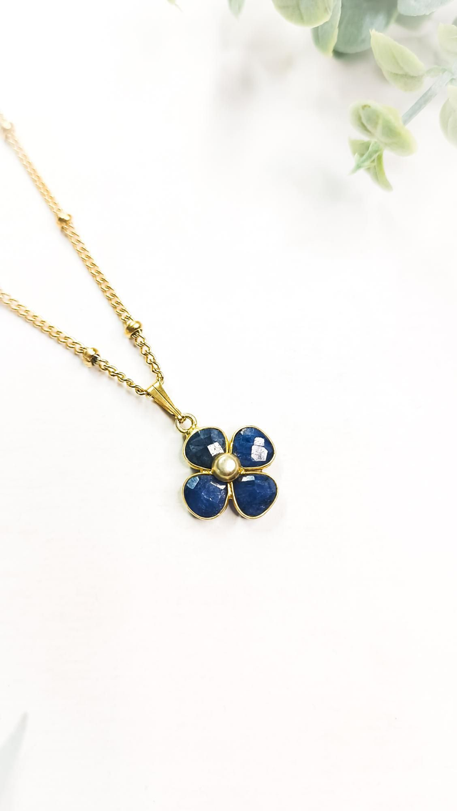 Avec le lapis lazuli, Tilah rend hommage à la sagesse et à la vérité intérieure. Cette pierre bleue étoilée favorise la communication authentique, l’intuition et l’harmonie de l’esprit. Symbole de chance et de profondeur, ce trèfle délicat monté sur acier inoxydable doré illumine le cou d’un éclat noble et raffiné, tout en guidant vers l’épanouissement personnel.